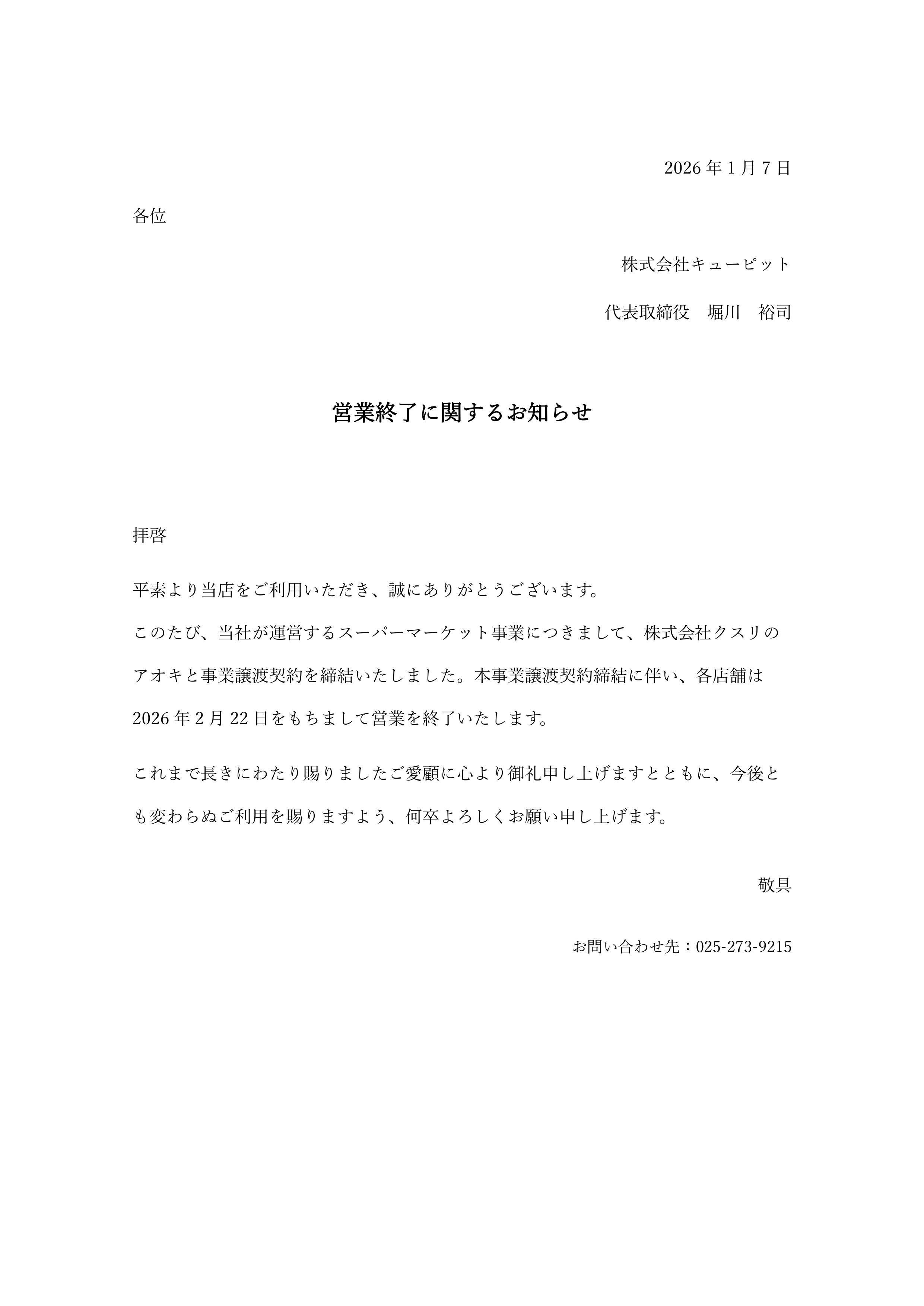 営業終了に関するお知らせ